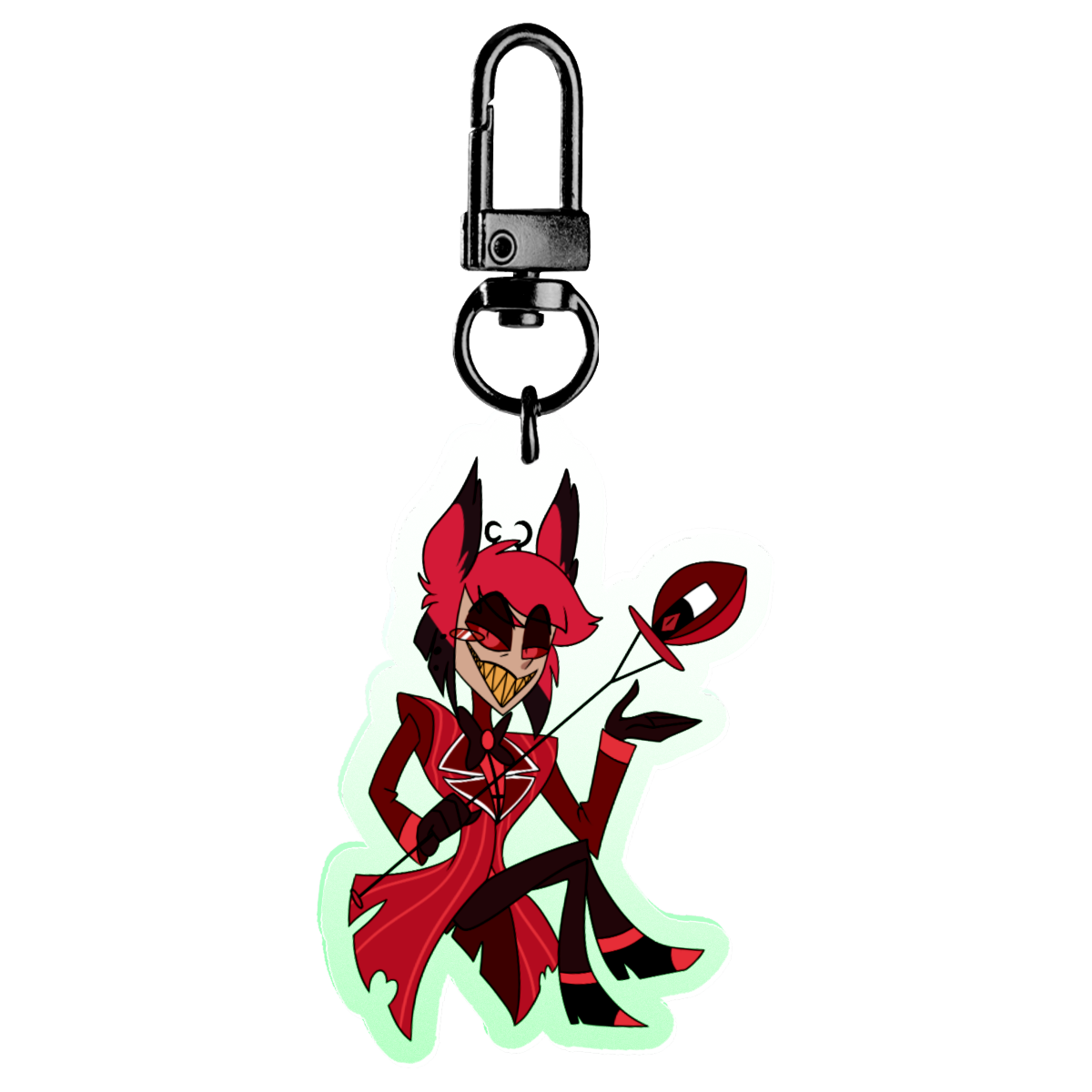 A colored edge acrylic charm featuring Alastor from Hazbin Hotel!