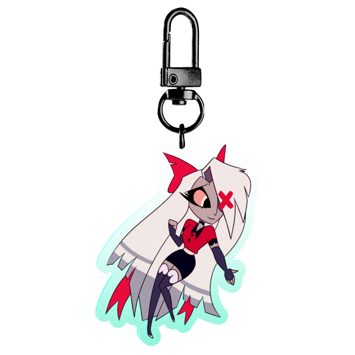 A colored edge acrylic charm featuring Vaggie from Hazbin Hotel!