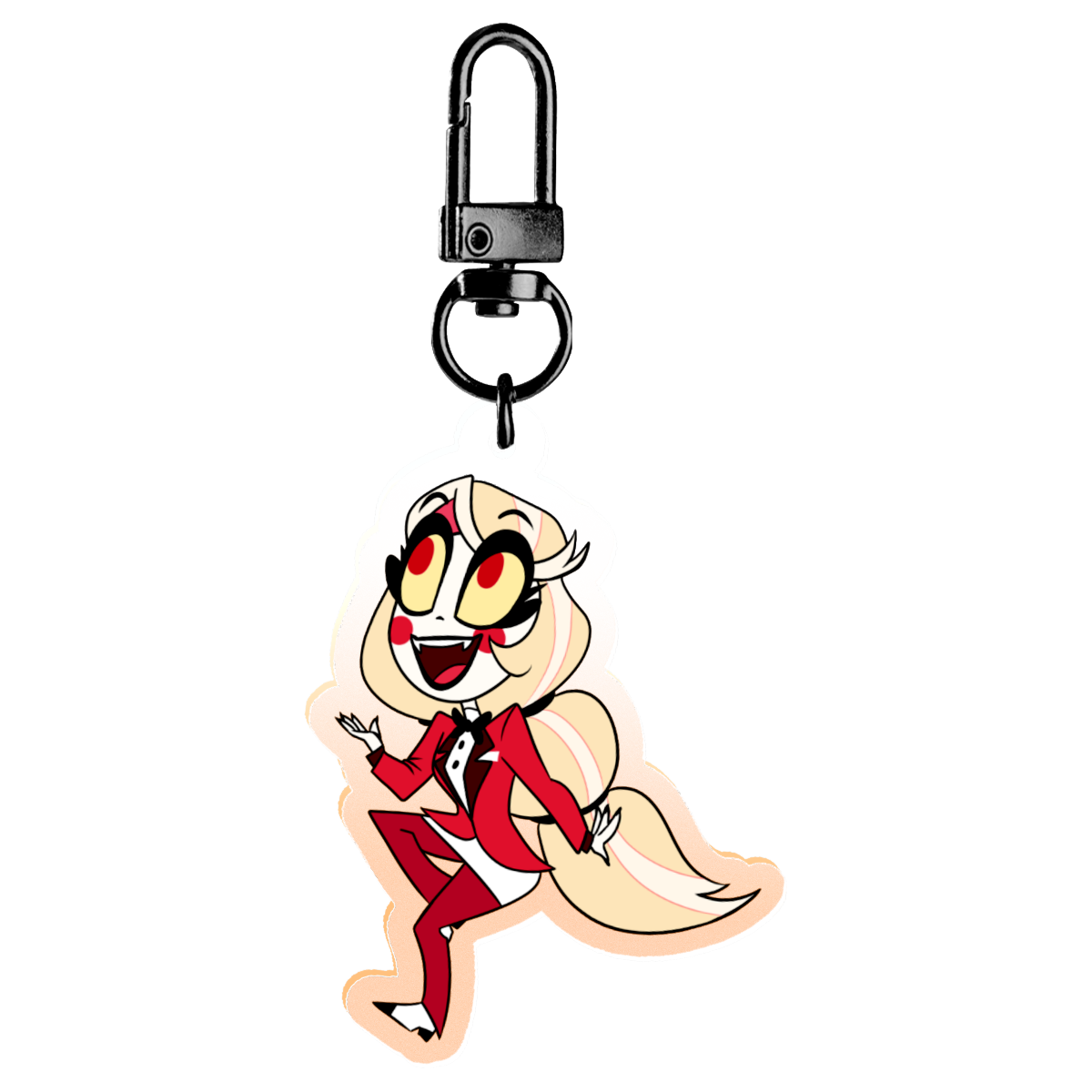 A colored edge acrylic charm featuring Charlie from Hazbin Hotel!