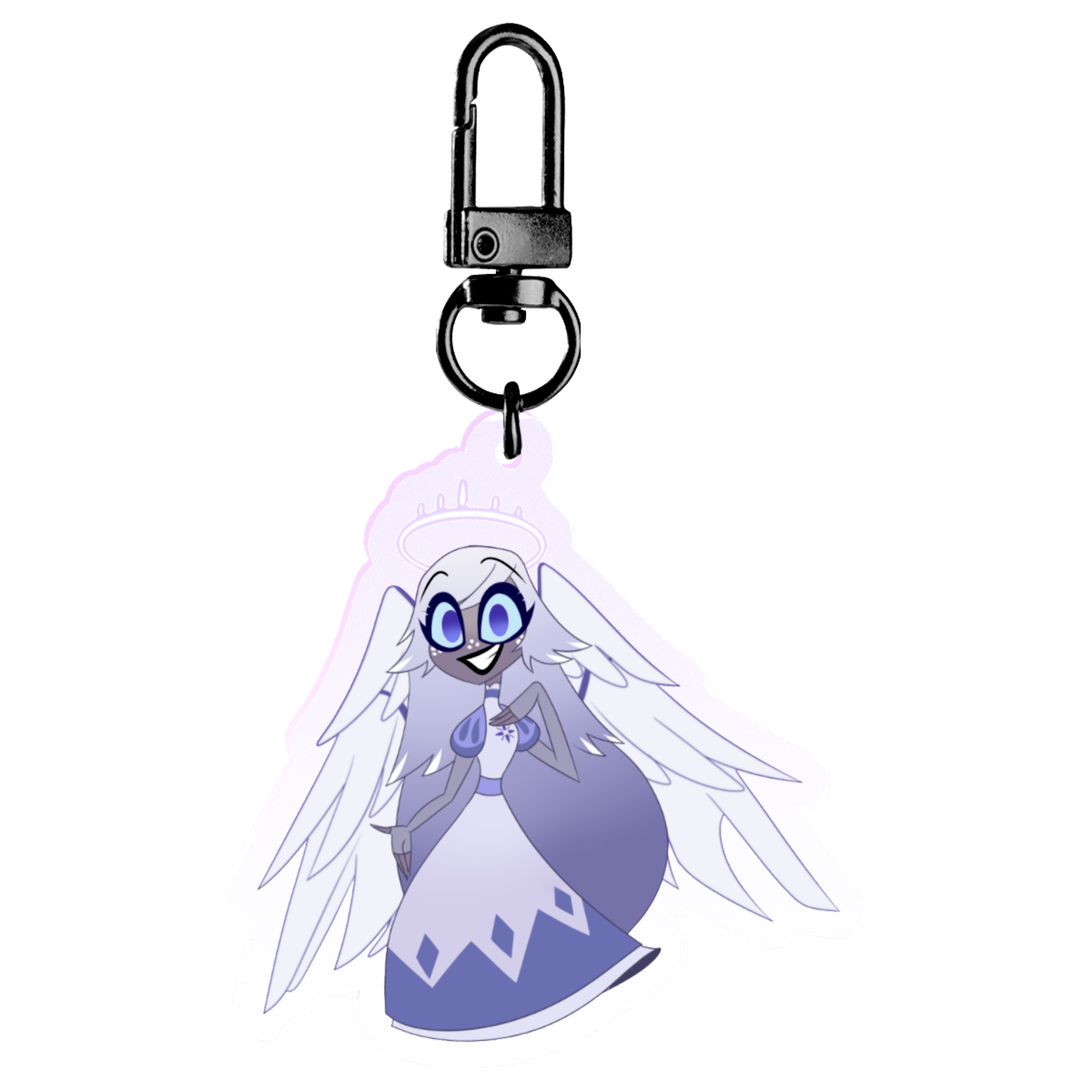 A colored edge acrylic charm featuring Emily from Hazbin Hotel!