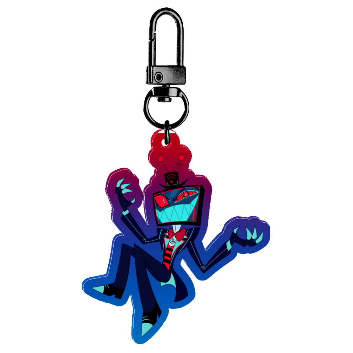A colored edge acrylic charm featuring Vox from Hazbin Hotel!