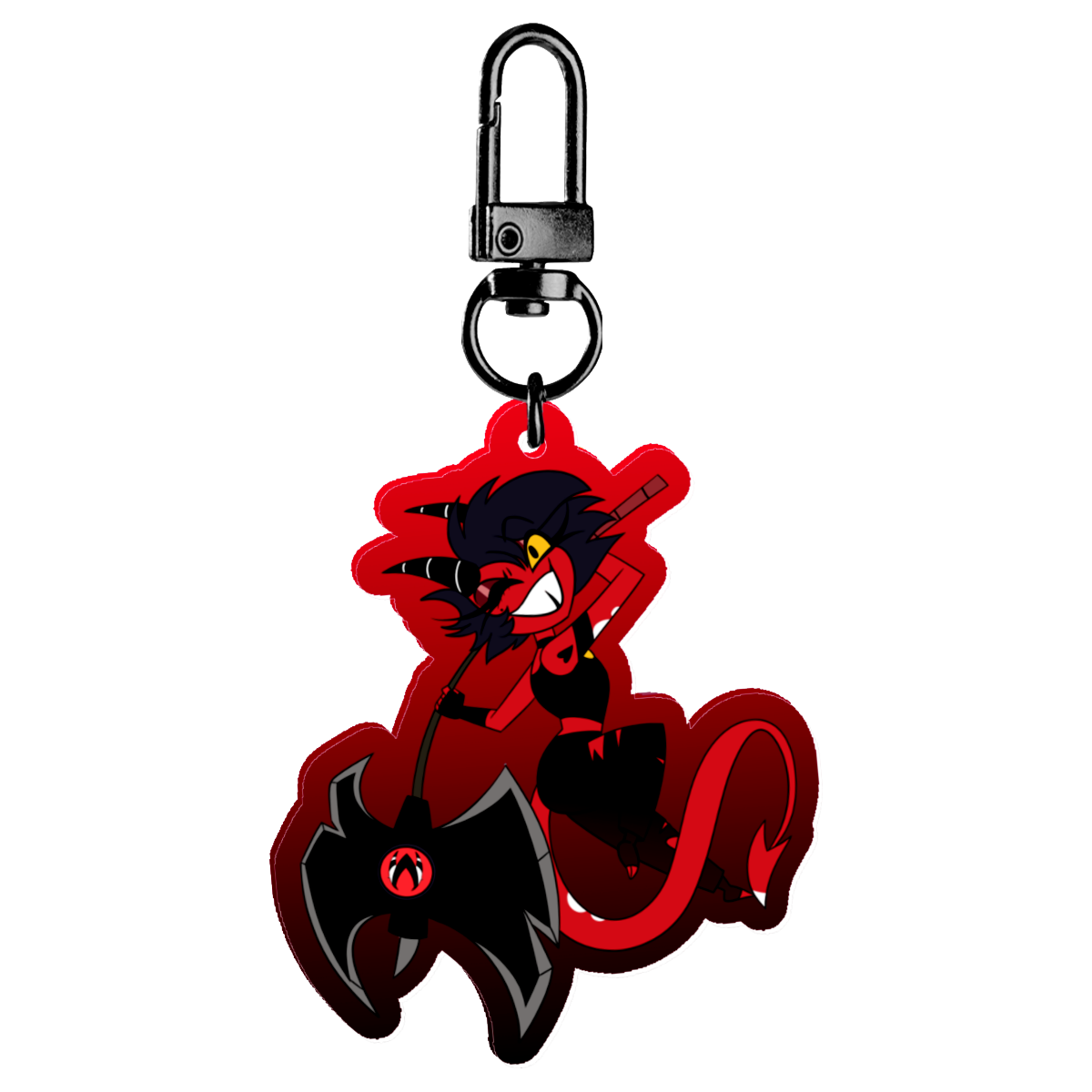 A colored edge acrylic charm featuring Millie from Helluva Boss!